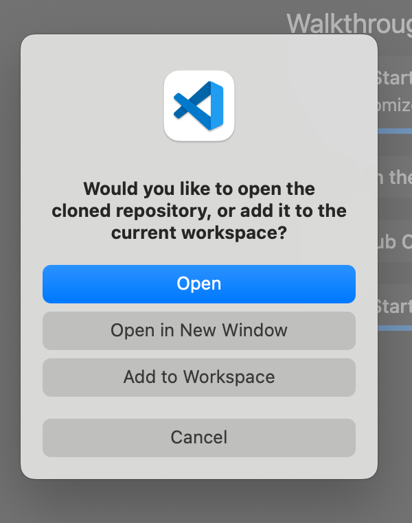 - When it finishes, VS Code will ask if you want to open it. Click Open.