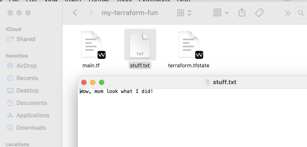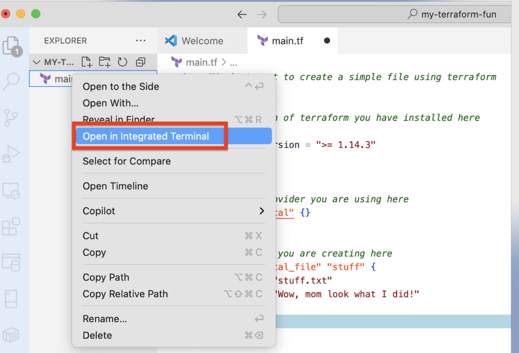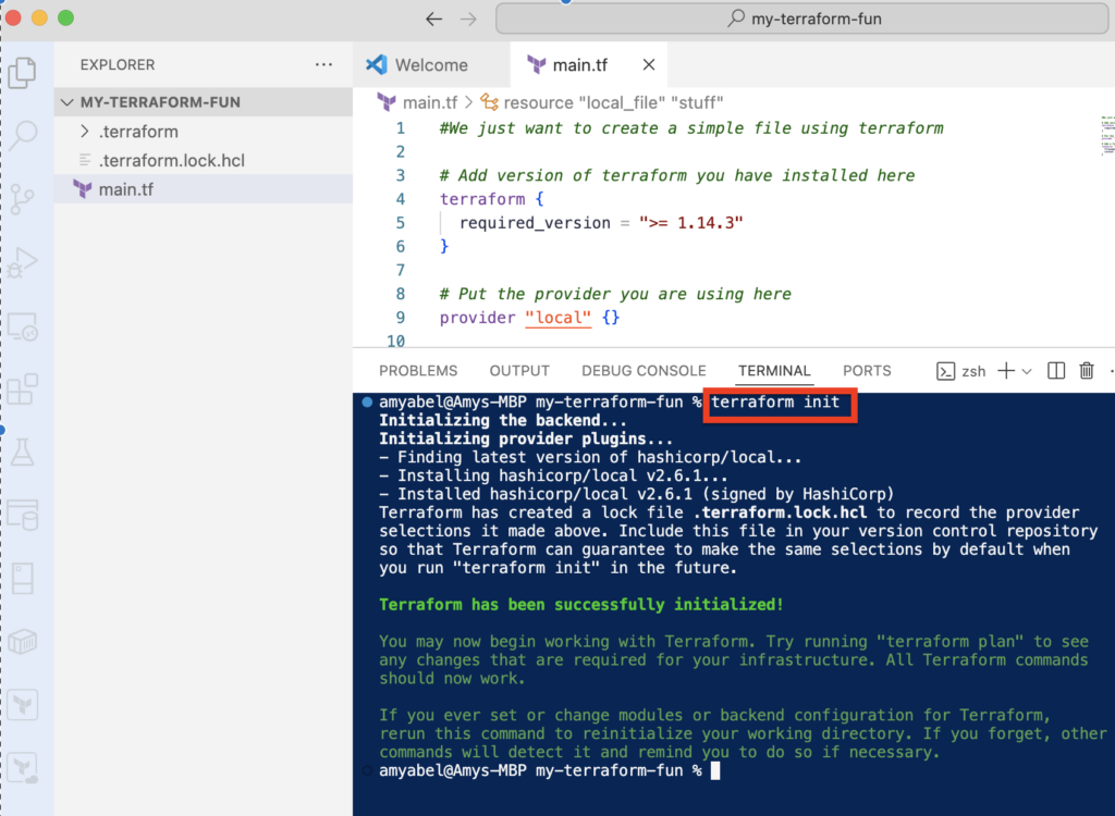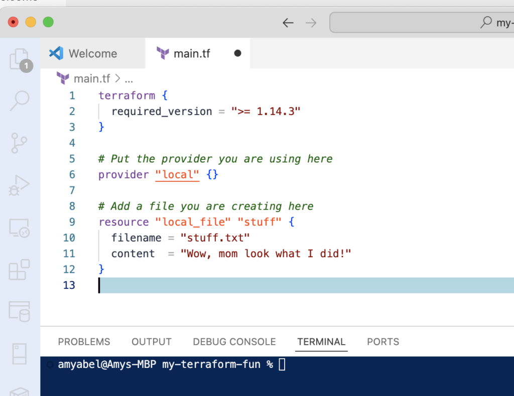 We are going to generate a text file on your local machine. This will let us know if Terraform is installed and working correctly.