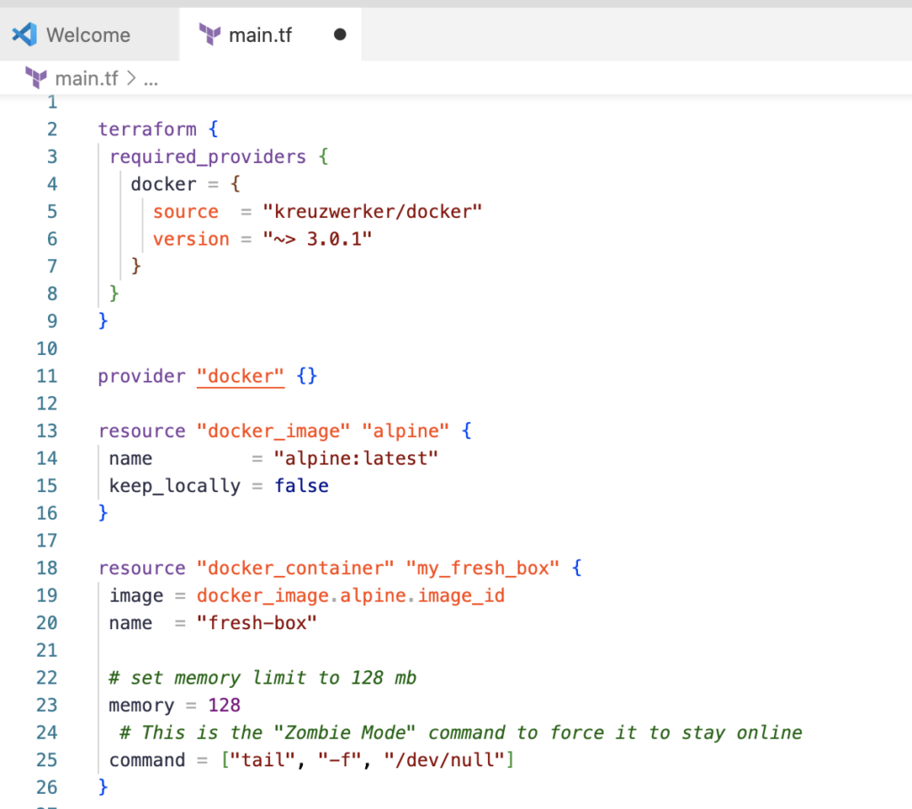 2. Update your main.tf file with the following code. We are replacing the local file configuration with the Docker provider.